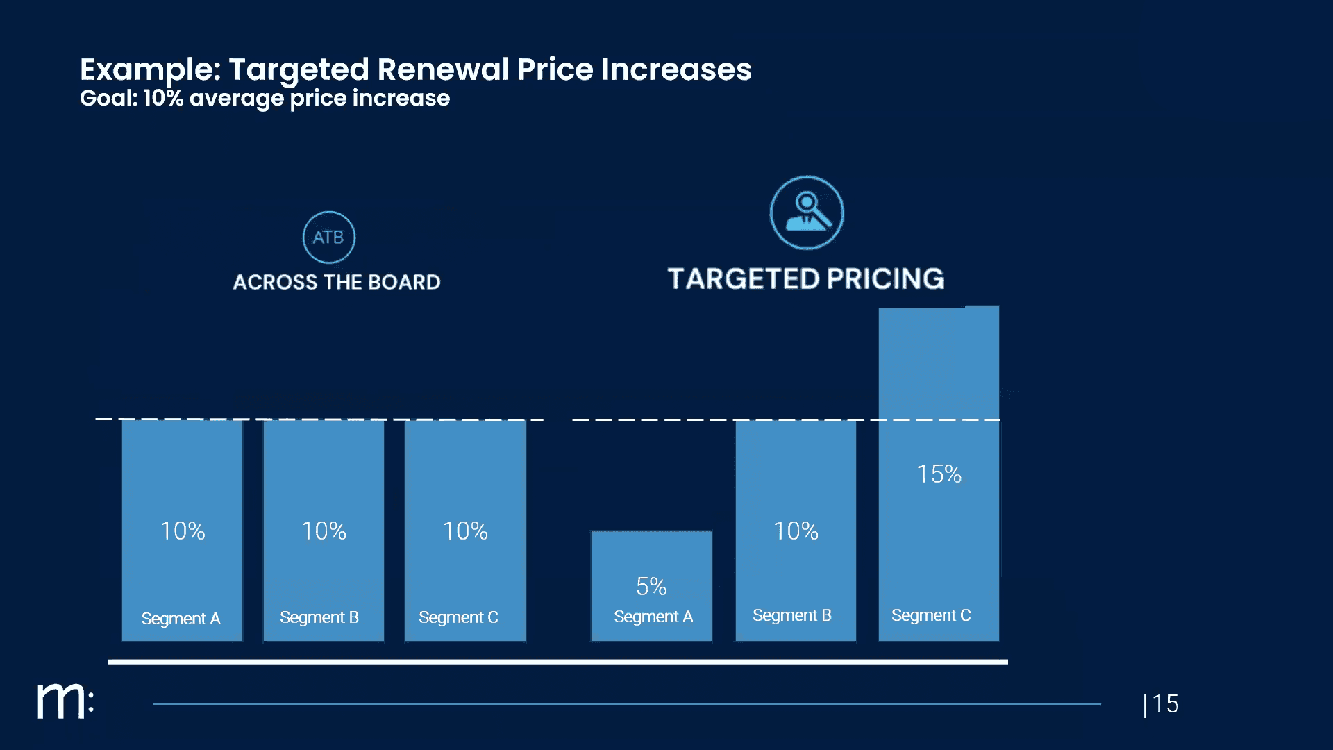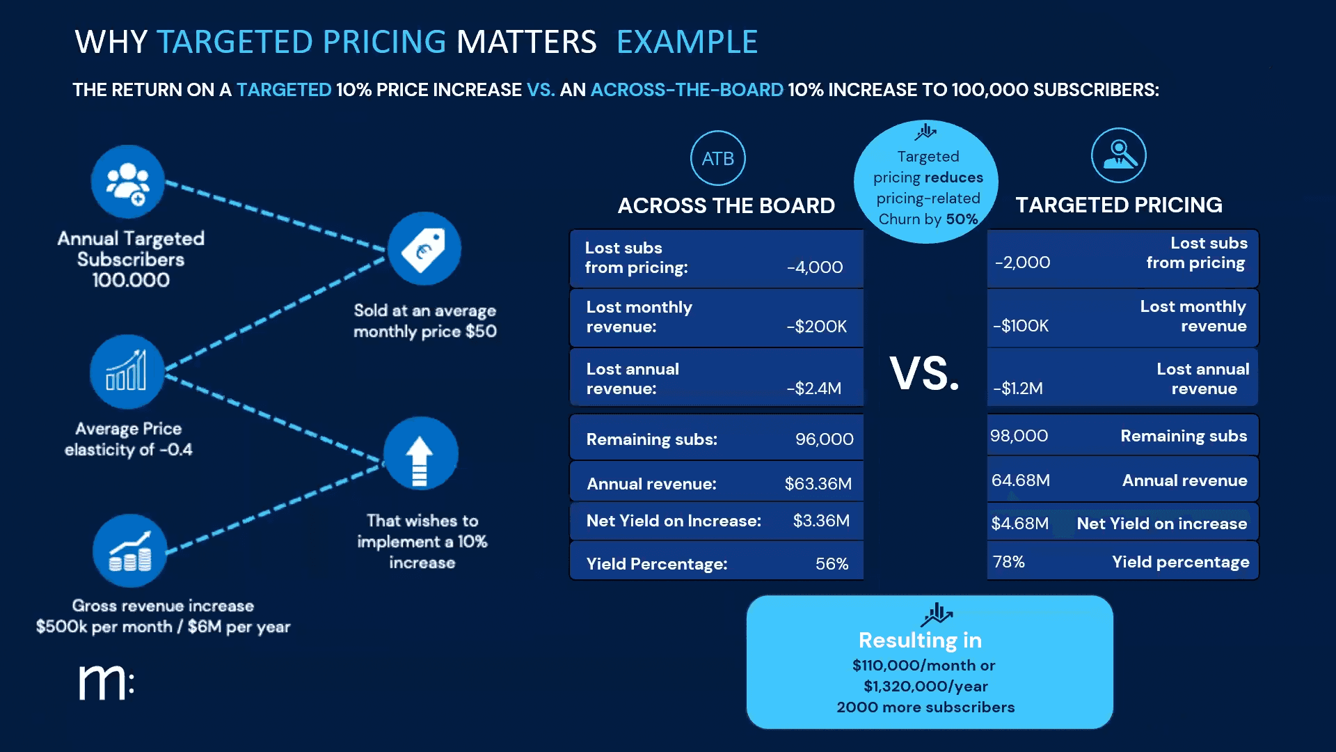 Here’s an example of a 10% price increase across the board vs. a 5%, 10%, and 15% targeted price increase to 100,000 subscribers paying $50 monthly.