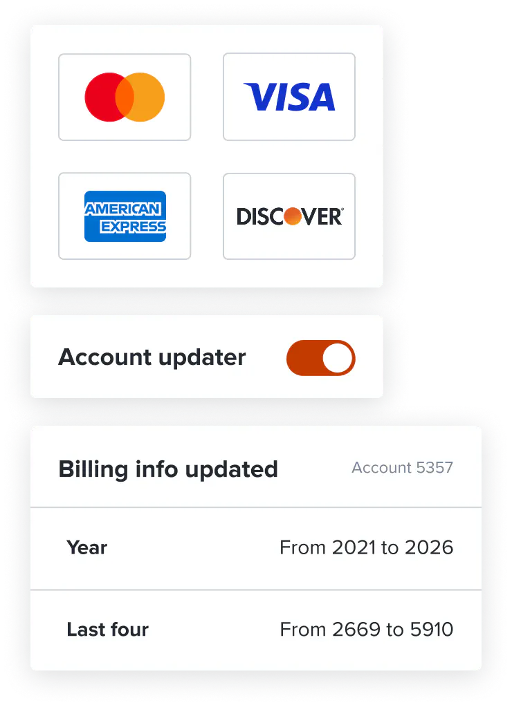 Automatically updates your customers’ credit cards to help recurring transactions process successfully.