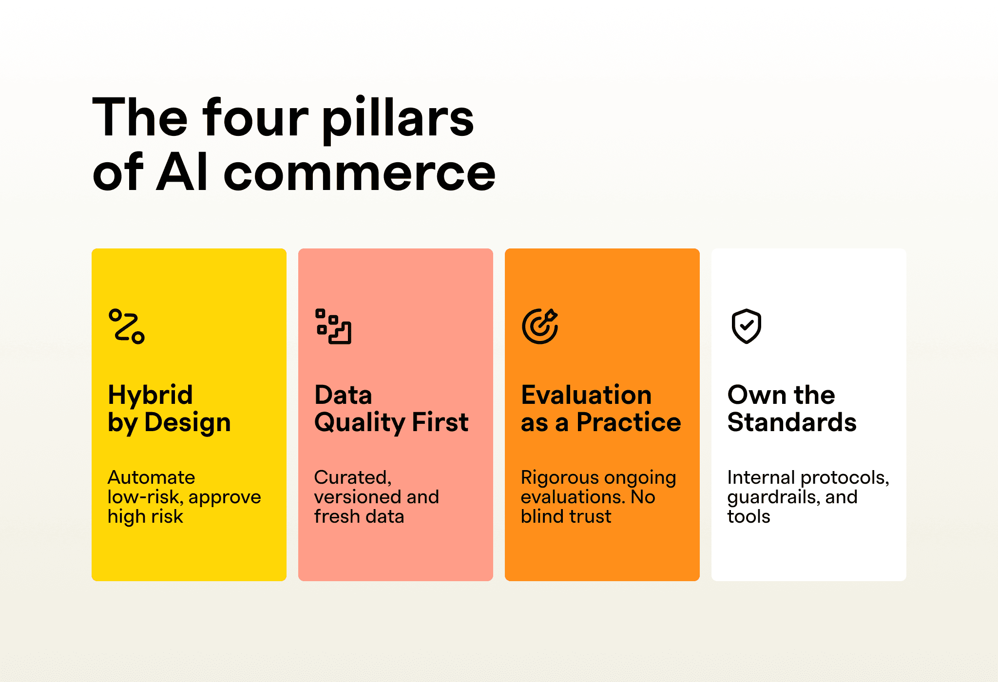 The market is shifting. Customers are moving from clicking in apps to asking AI agents to act, and soon, AI-to-AI interactions — a customer’s agent negotiating with a merchant’s agent — will be normal. For commerce, this transition erodes legacy moats and resets the competitive landscape; delivering measurable, AI-driven outcomes is the new differentiator. This shift only works if we combine automation at scale with human control for sensitive operations.