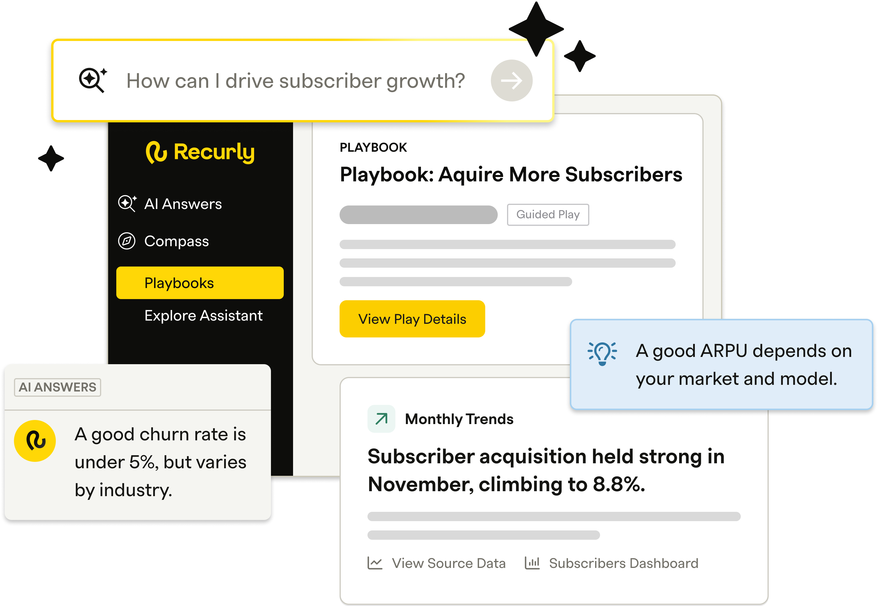 Recurly Compass AI empowers you to drive growth with smarter, faster decisions. Gain personalized insights, proven subscription strategies, and unlock answers with ease. Turn insights into action.