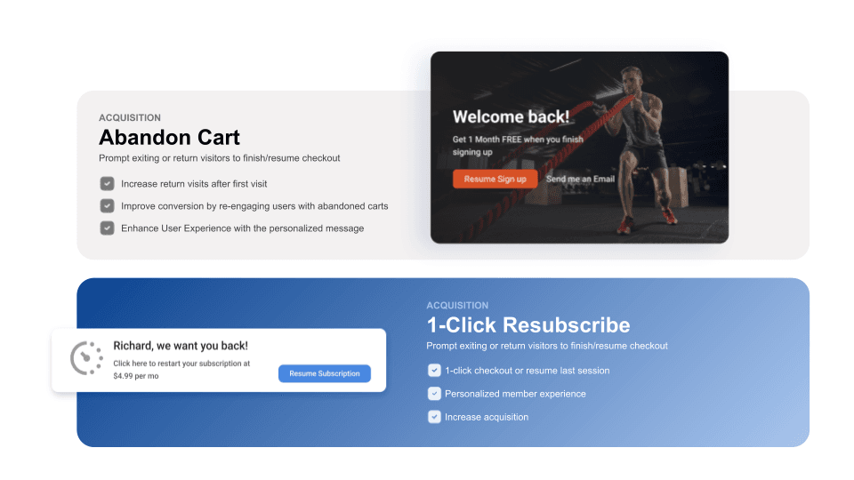 For example, you can create a customized prompt that recognizes users who abandoned their cart, offers them an incentive to sign up, and, with a single click, brings them back to their previous position in the checkout flow without starting from scratch.