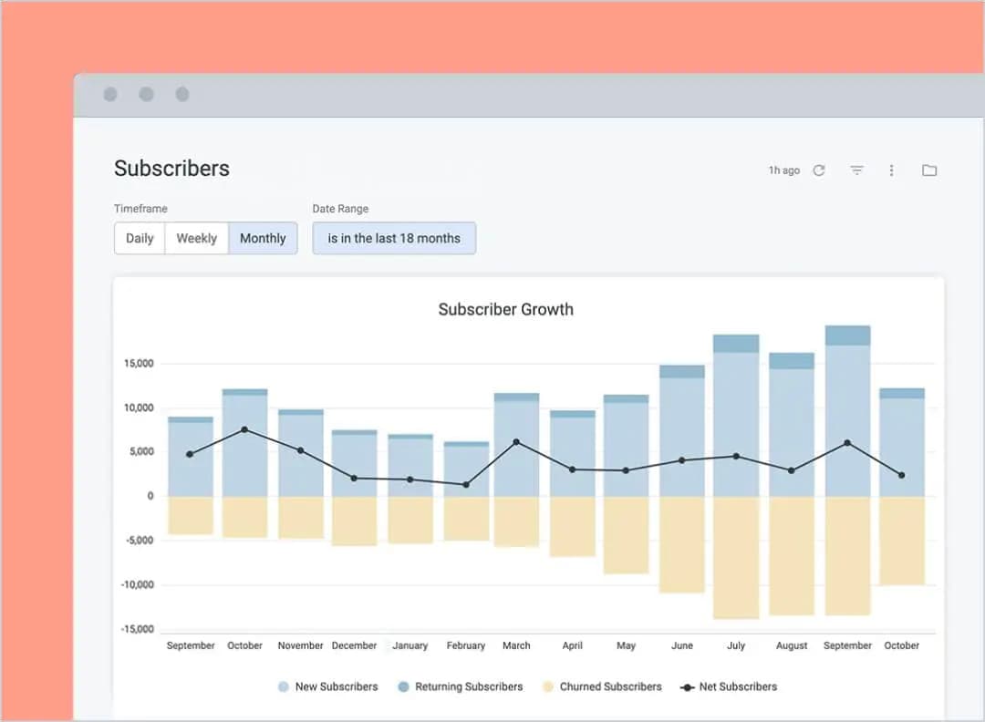 Subscription analytics pull together all critical subscription data for easy review and analysis. There are critical metrics that businesses should monitor surrounding customer acquisition, subscriber revenue, and retention. Read more about subscription analytics best practices.
